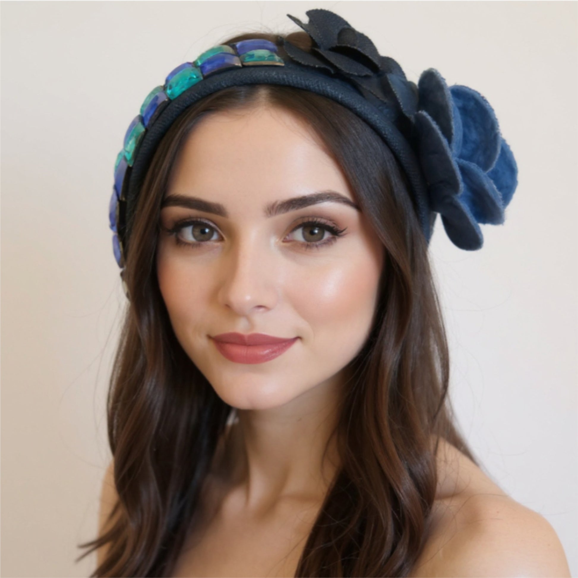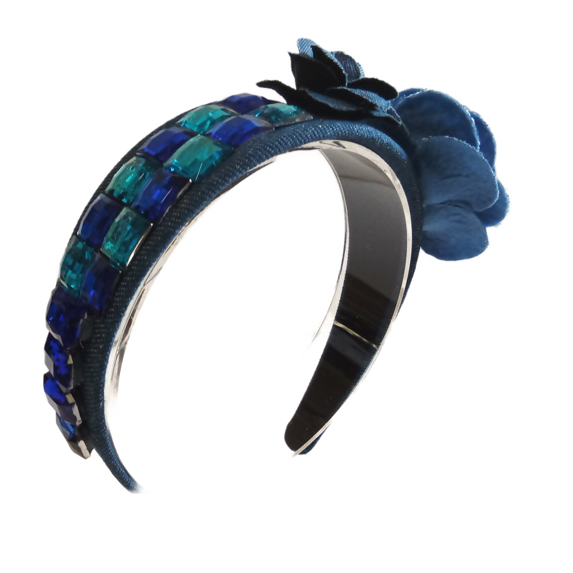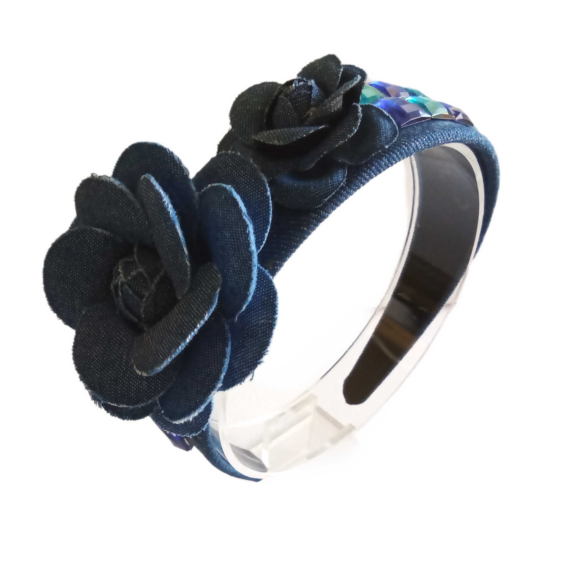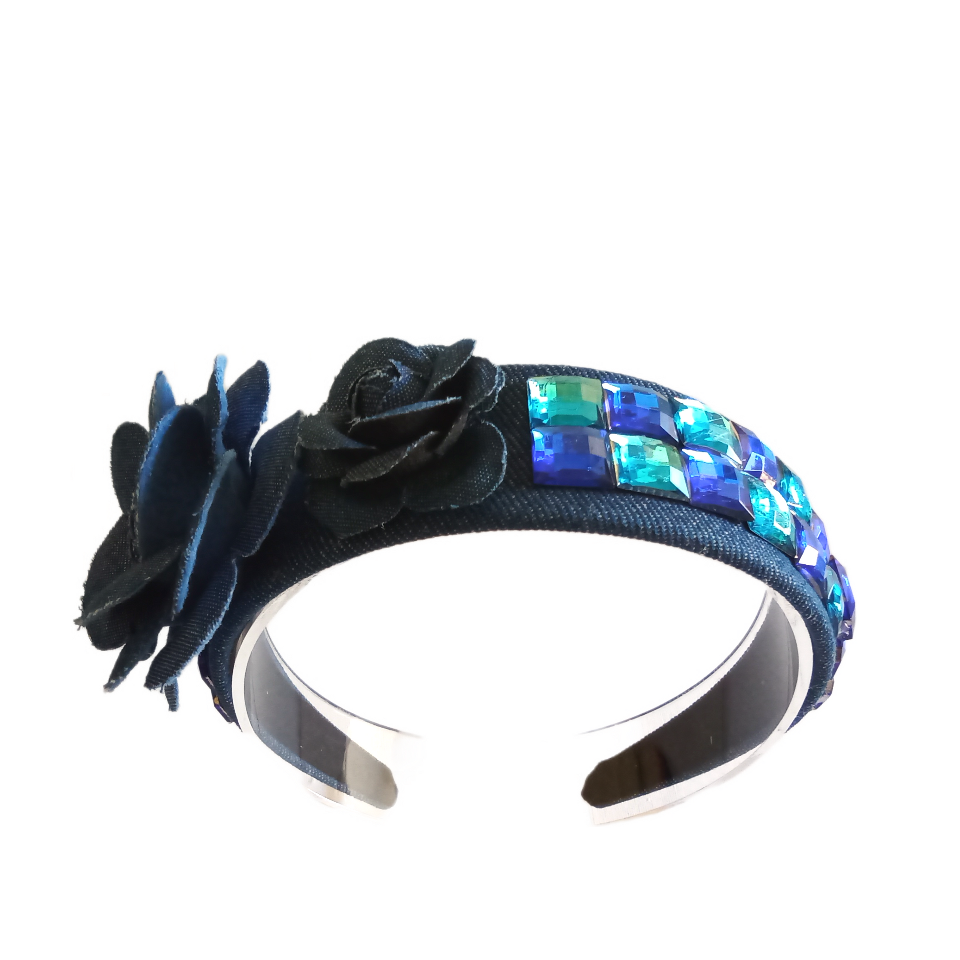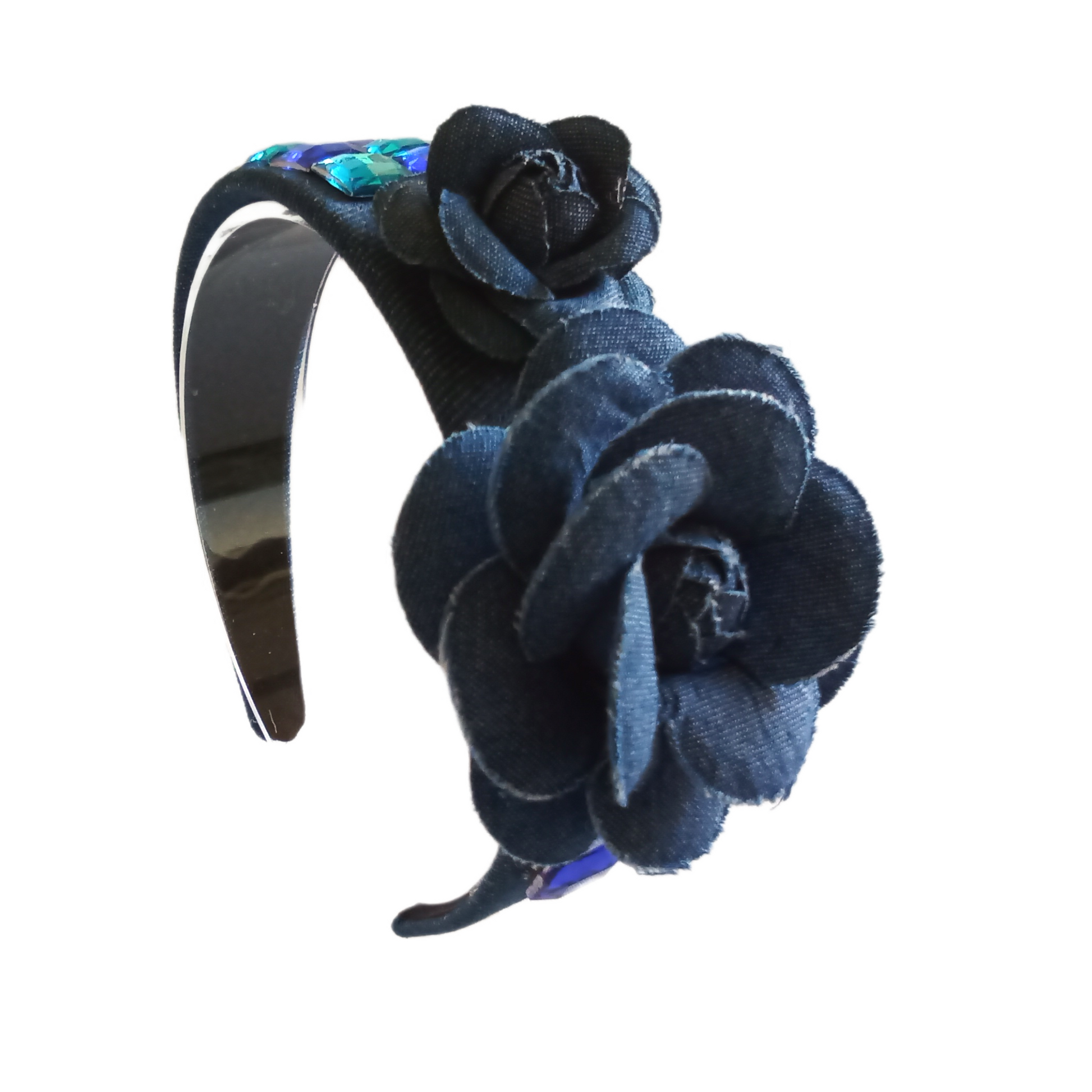 Made from denim fabric, this headband features delicate roses and sparkling rhinestones for a touch of elegance. Perfect for adding a pop of colour and charm to any outfit.