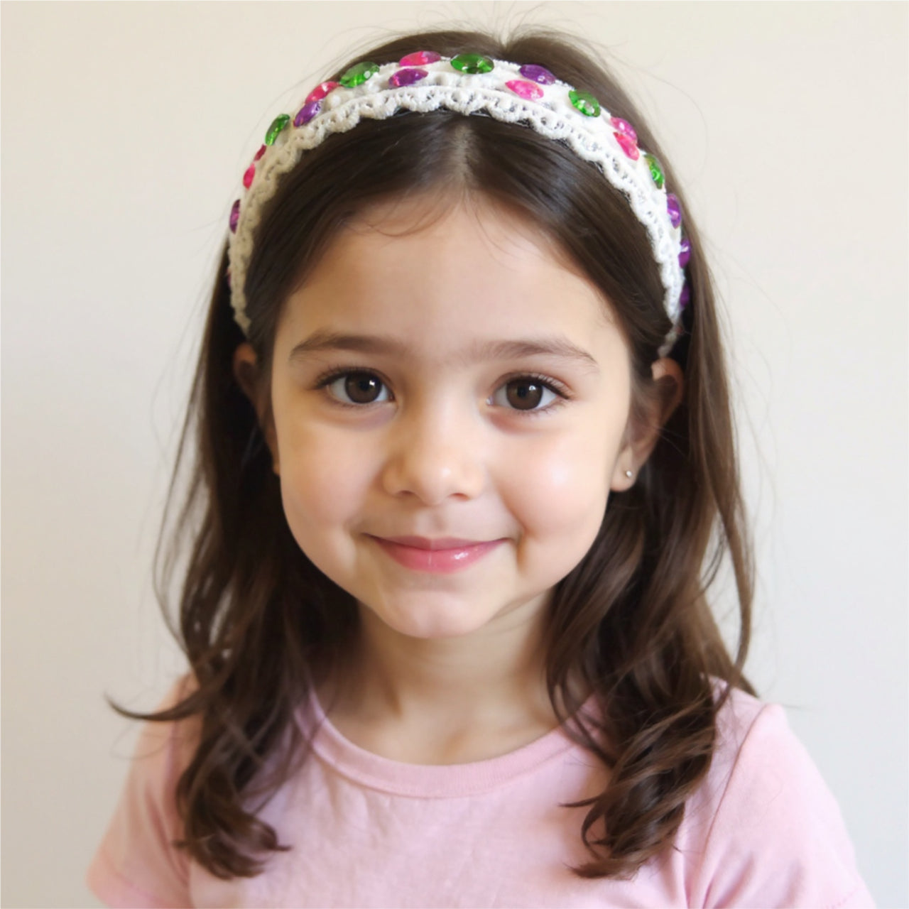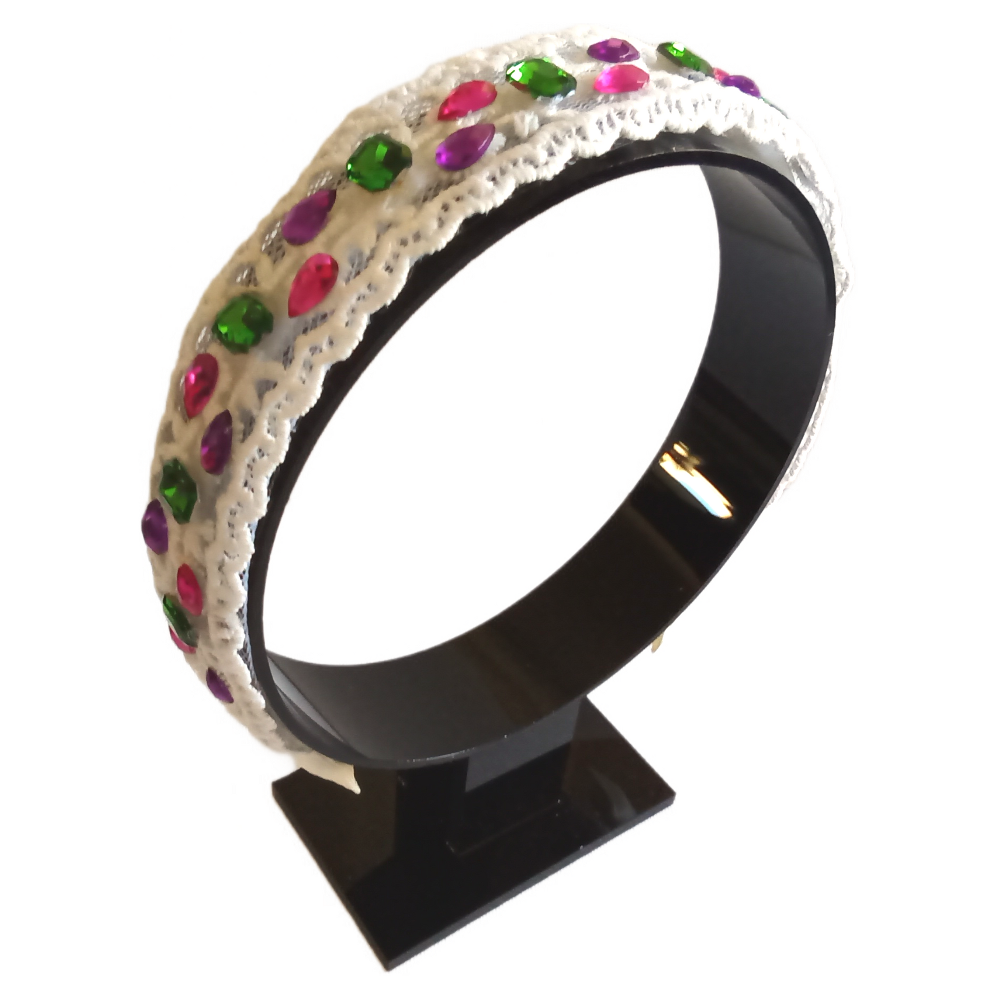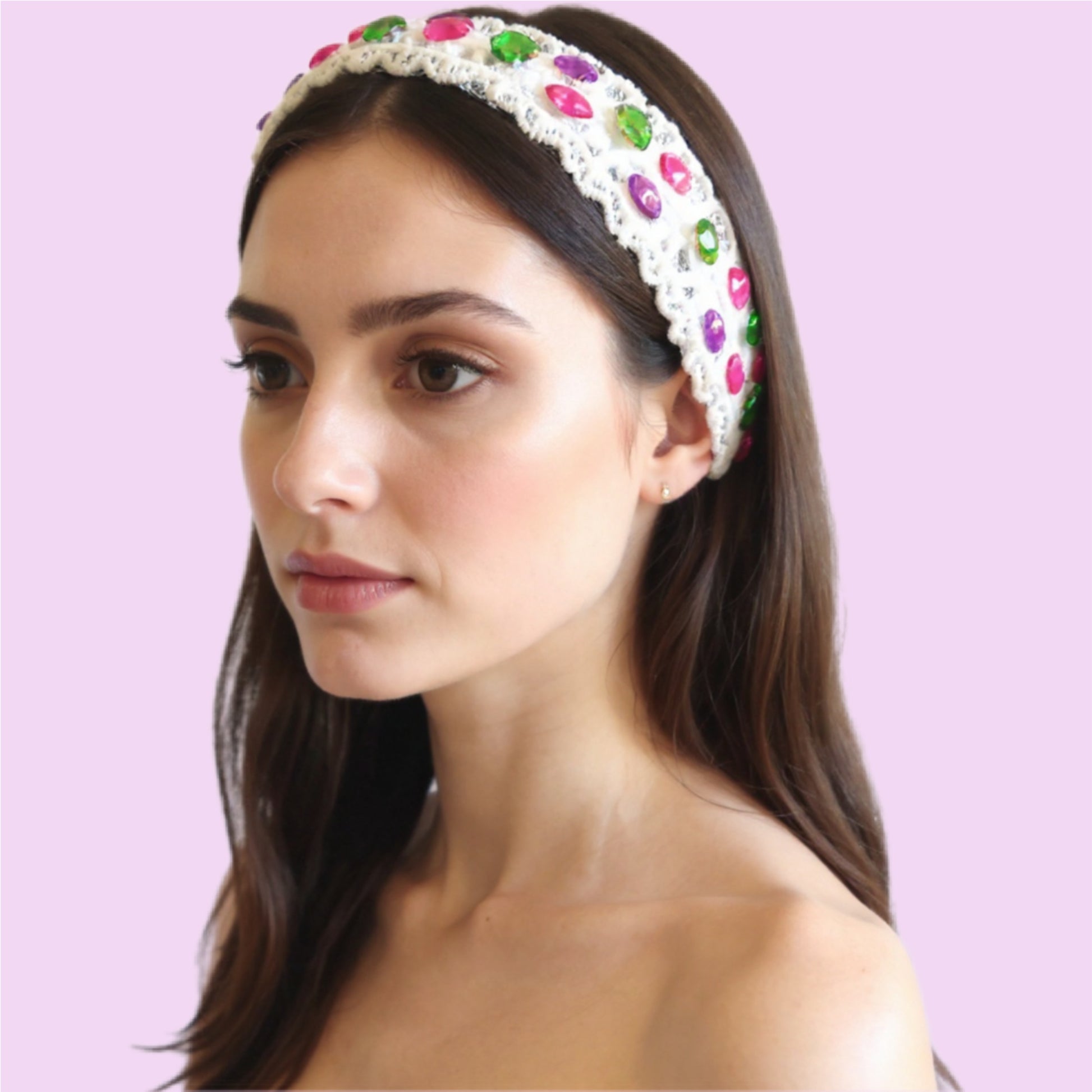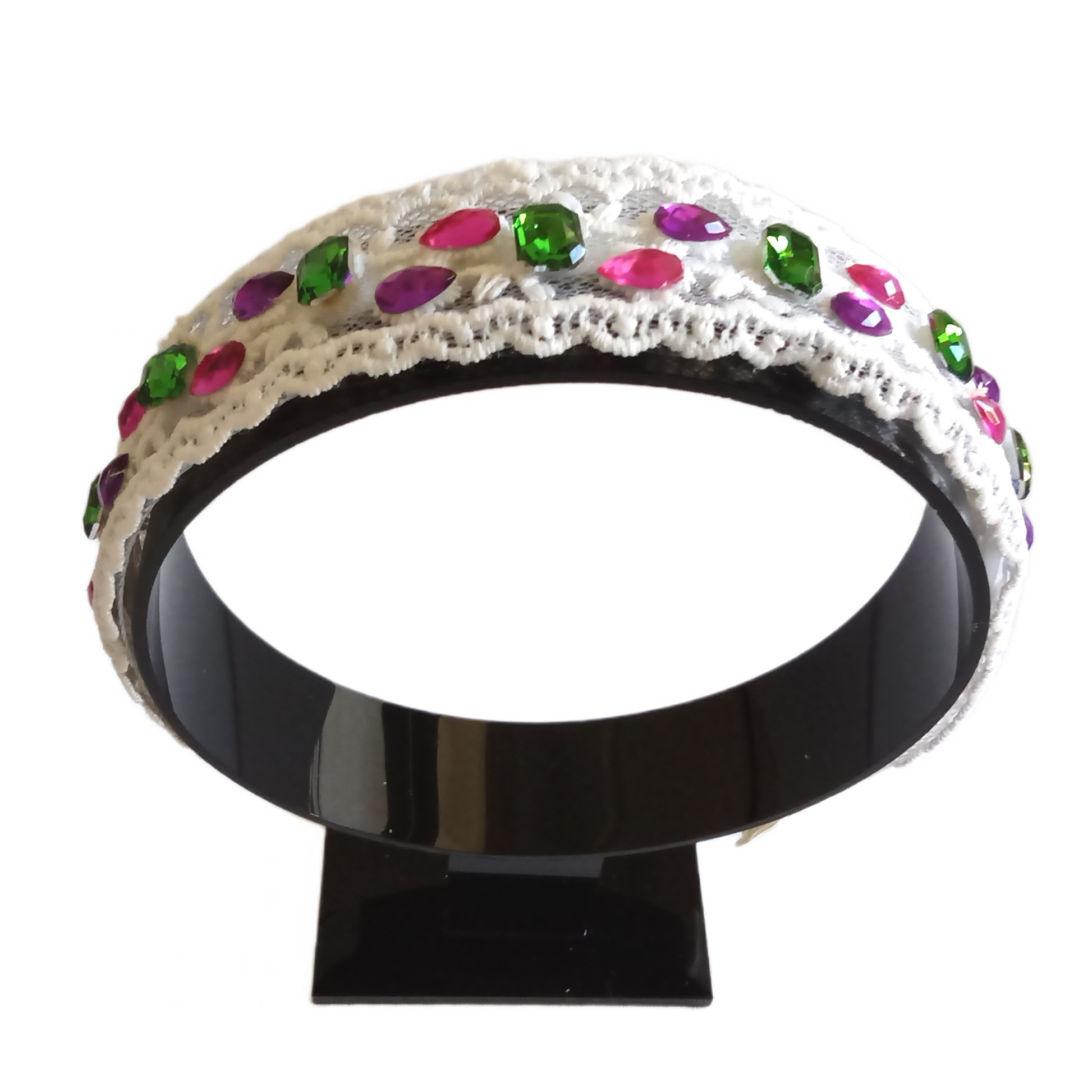 The Bouvardia floral headband features delicate lace fabric and intricately placed colour rhinestones, creating a stunning accessory for any occasion.