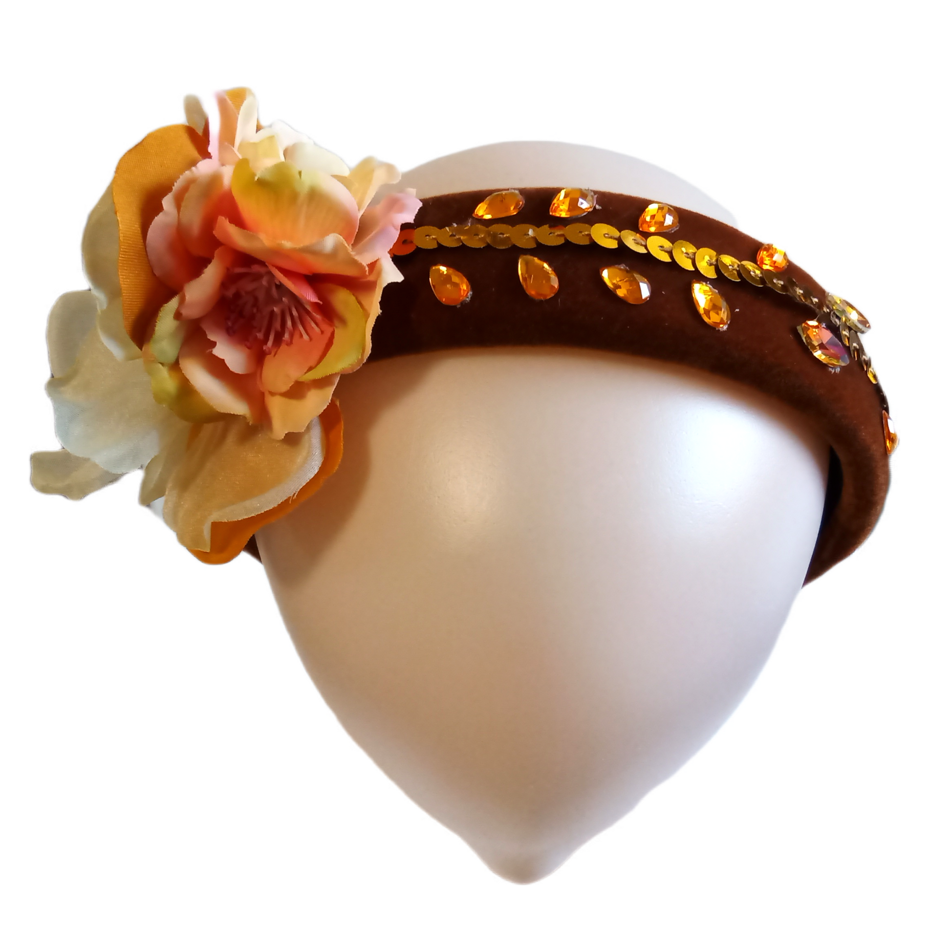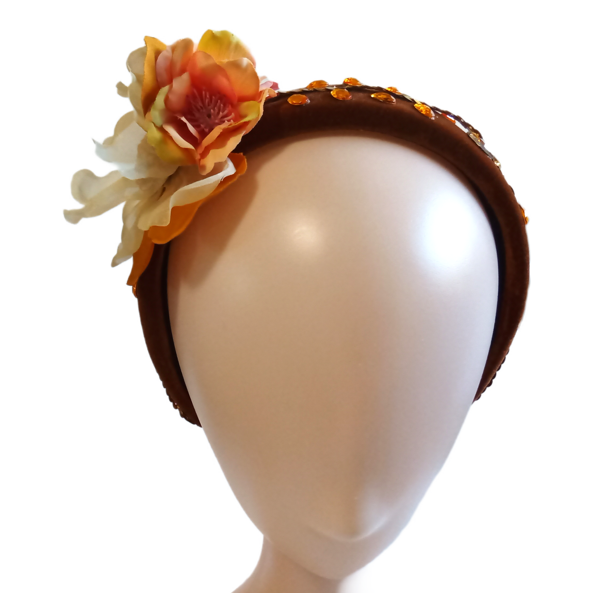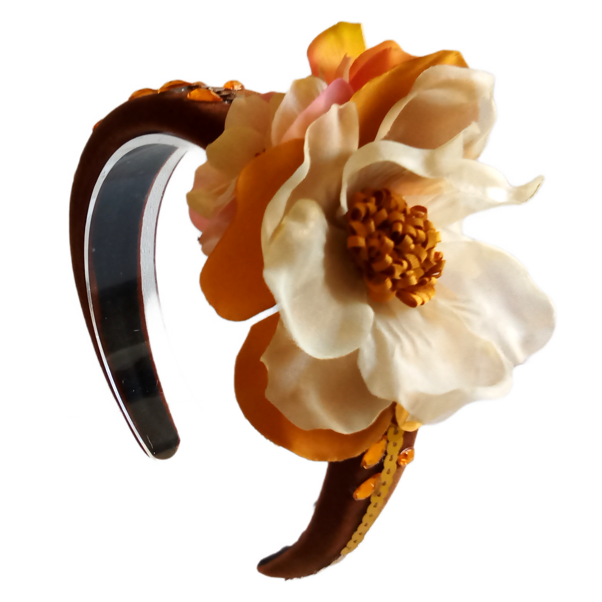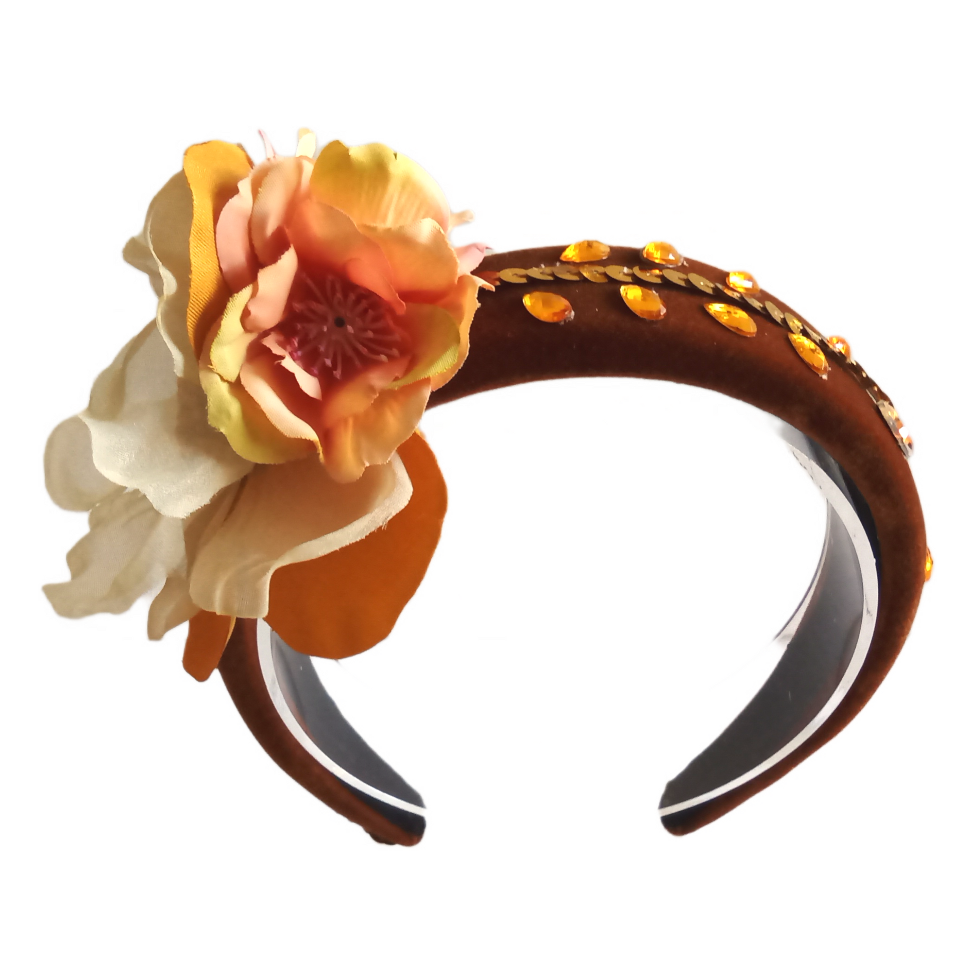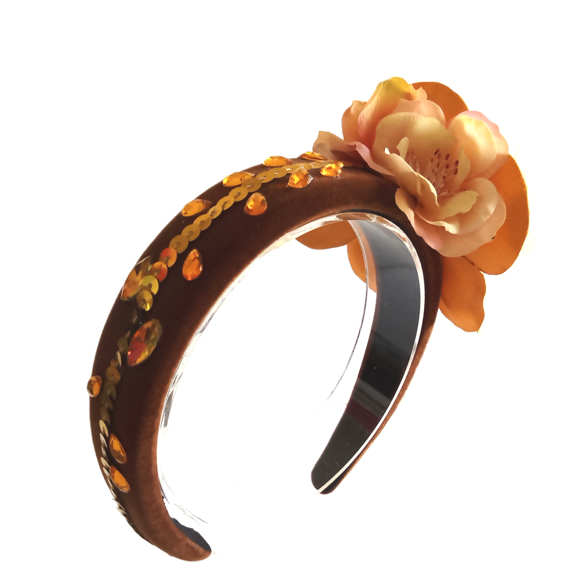 This Celosia floral headband features a beautiful design of delicate flowers made with shimmering rhinestones and sparkling sequins. Perfect for adding a touch of glamour to any outfit.