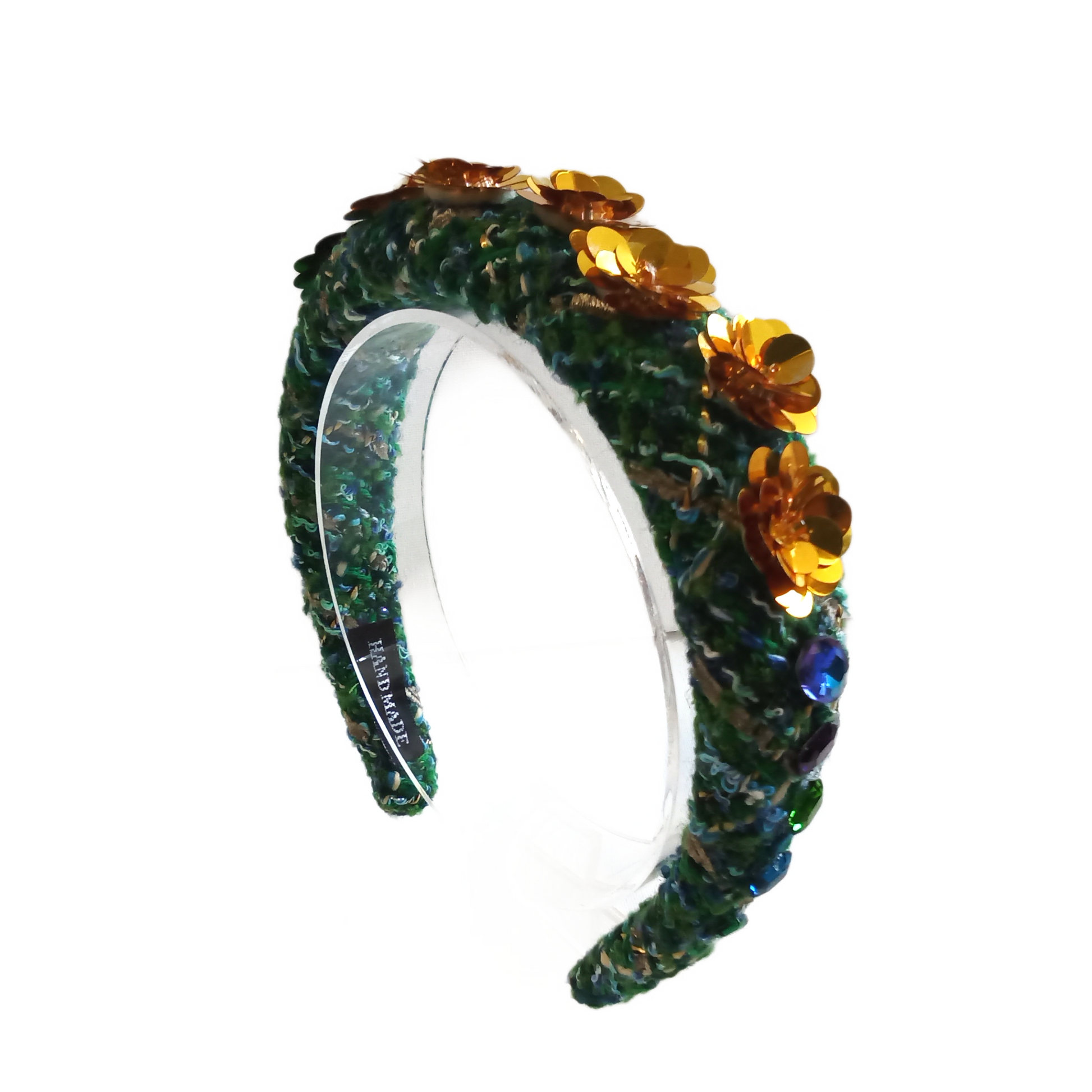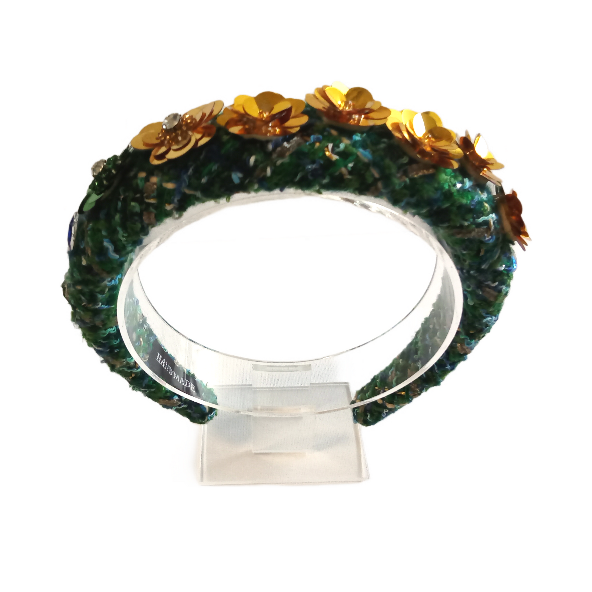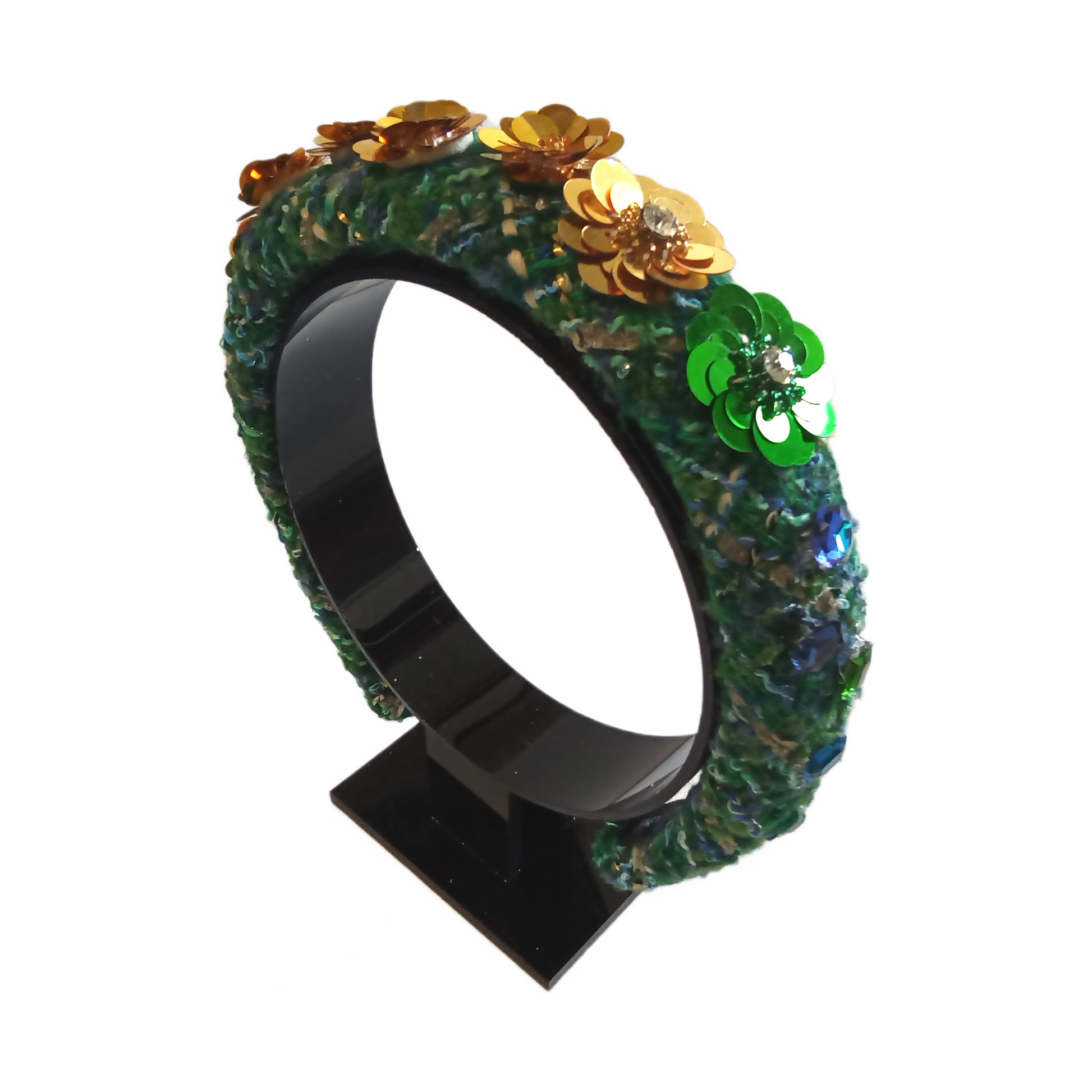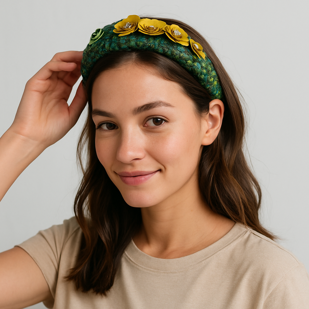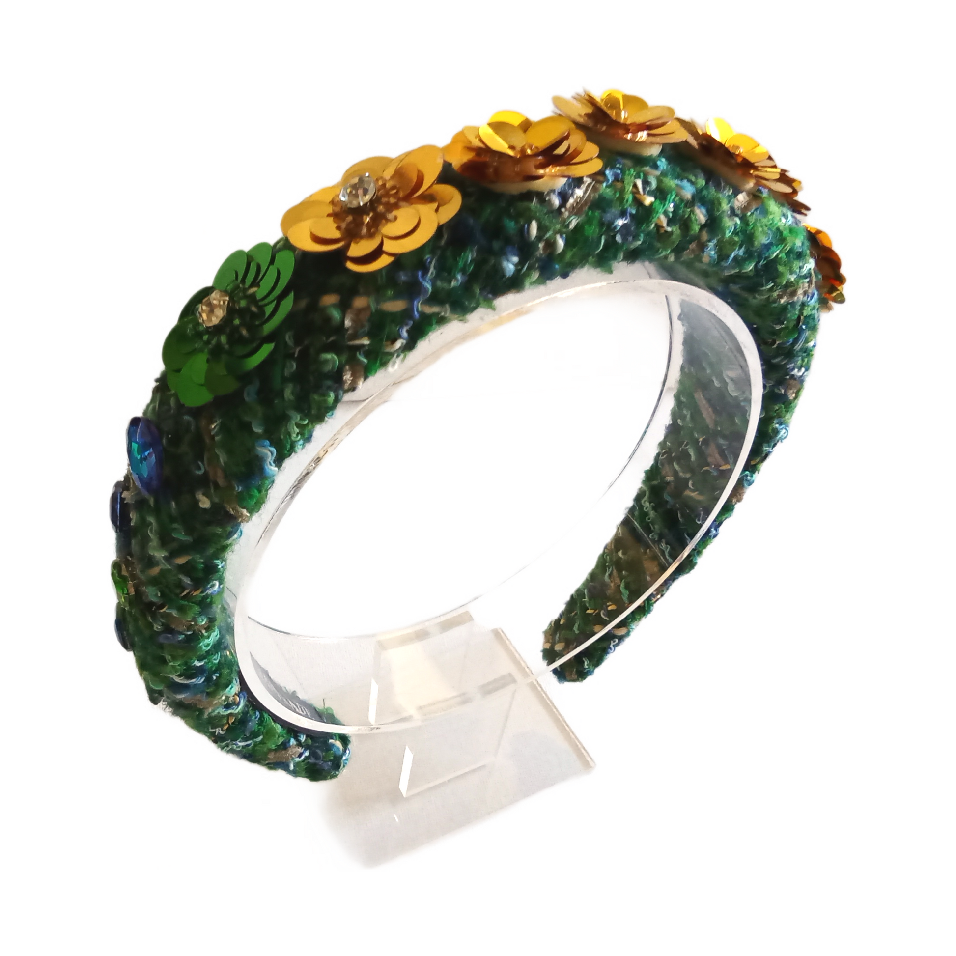 This Clematis floral headband features a vibrant multi-coloured woollen fabric adorned with sparkling rhinestones and delicate sequin flowers. With its unique combination of materials, this headband adds a touch of glamour to any outfit.