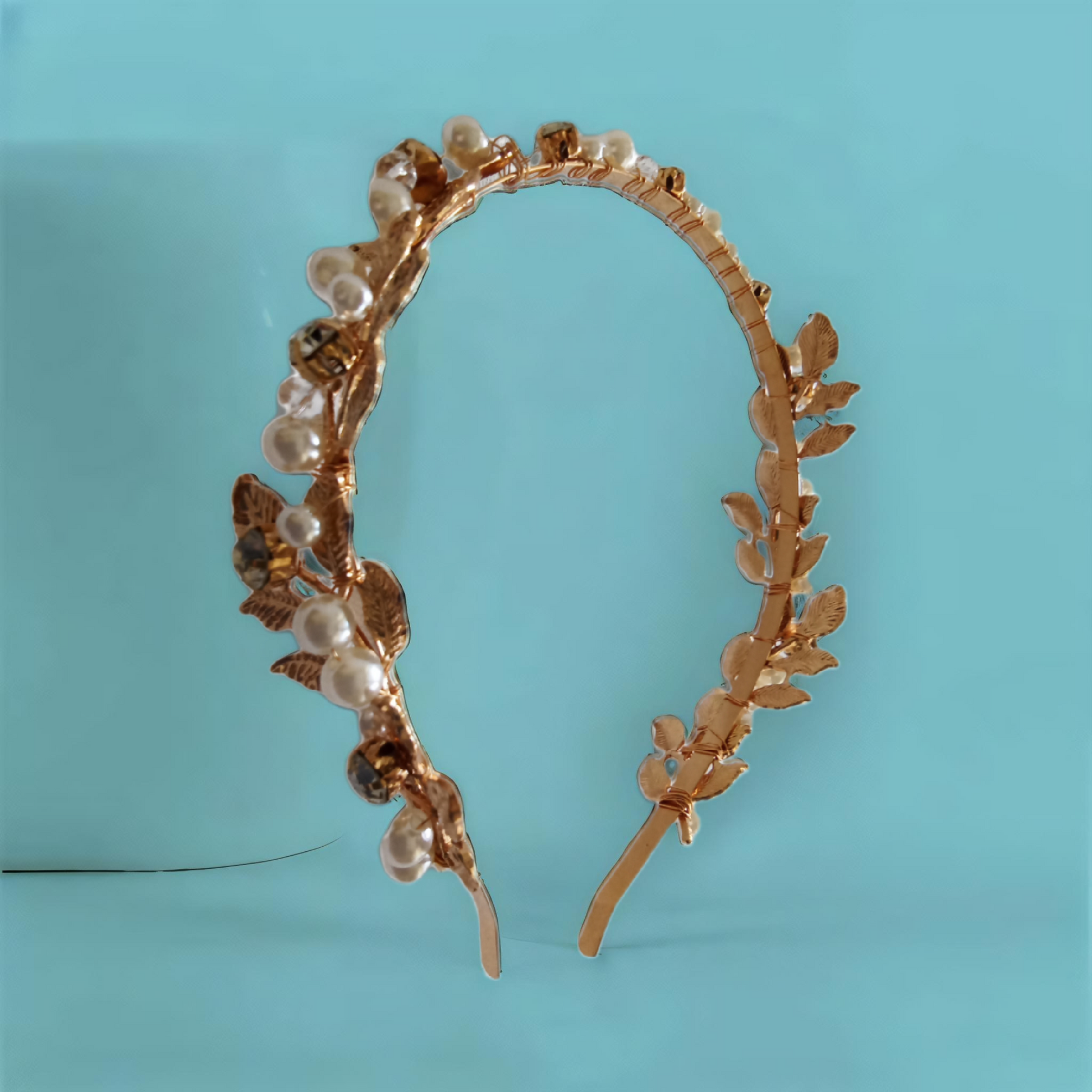 Expertly crafted with a stunning combination of gold leaves and pearls, this head piece adds a touch of elegance and sophistication to any ensemble. Perfect for weddings, formal events, or everyday wear, it's a must-have accessory for those who appreciate timeless beauty.