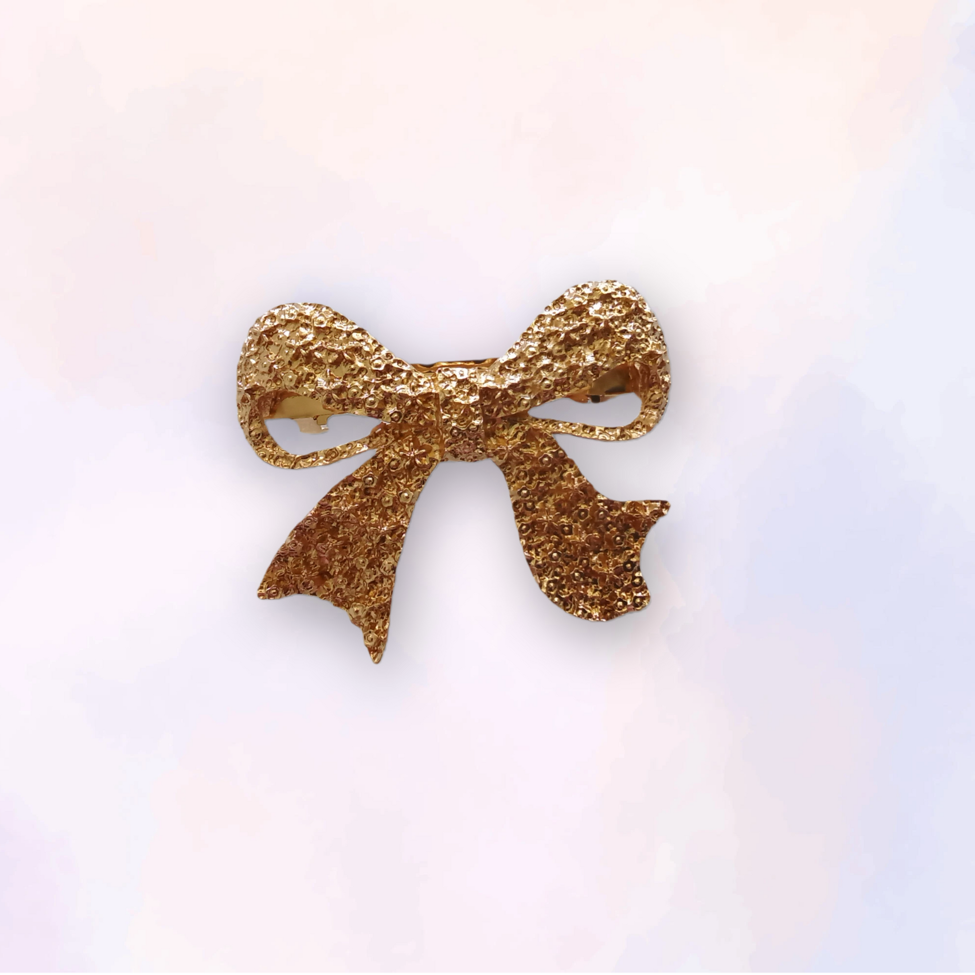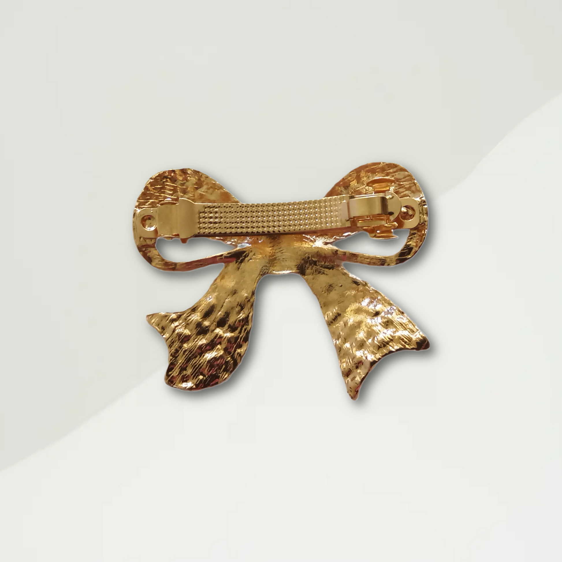 Crafted with a beautiful gold ribbon design, this hair clip adds a touch of elegance to any hairstyle. This clip securely holds hair in place while offering a sophisticated look. Perfect for any occasion.
