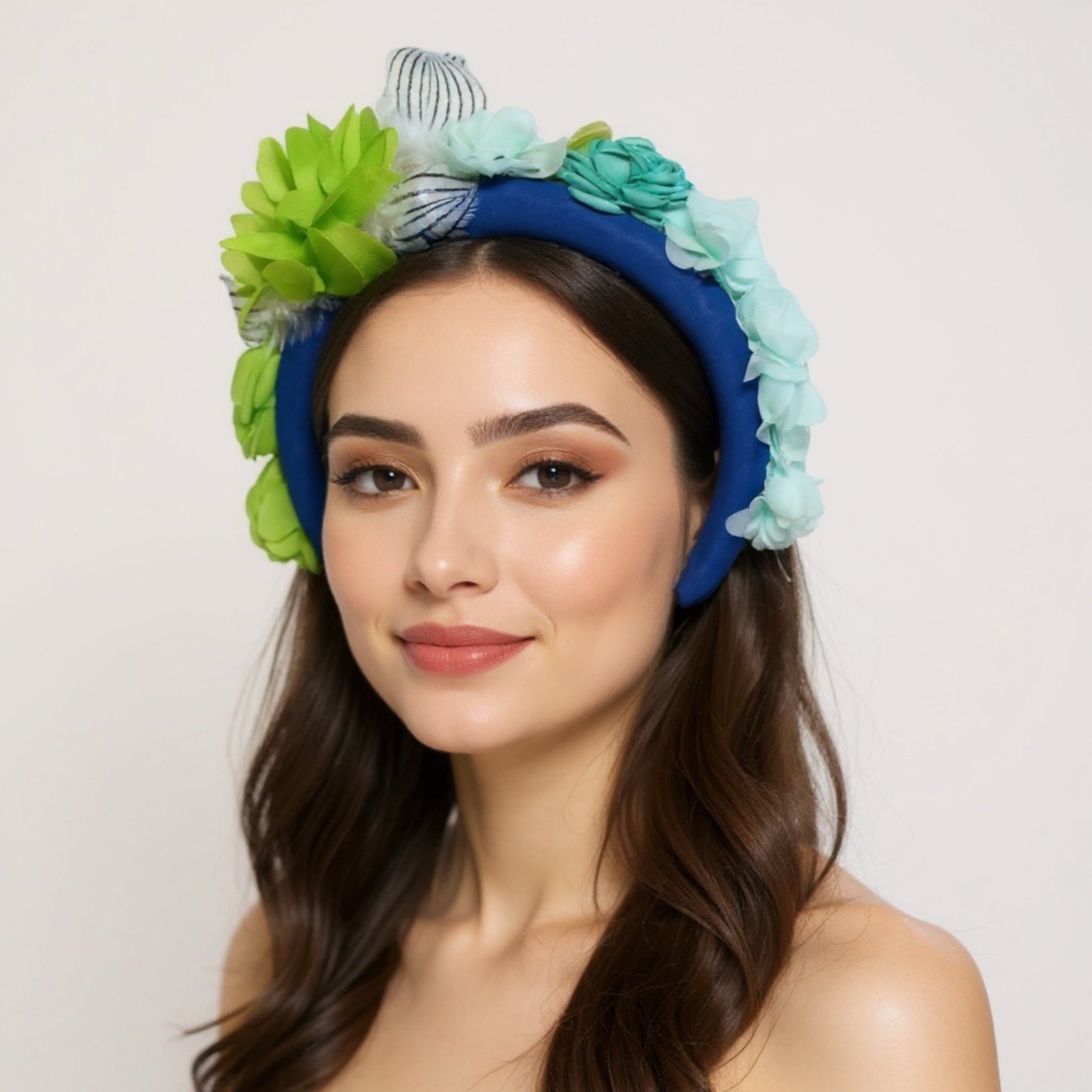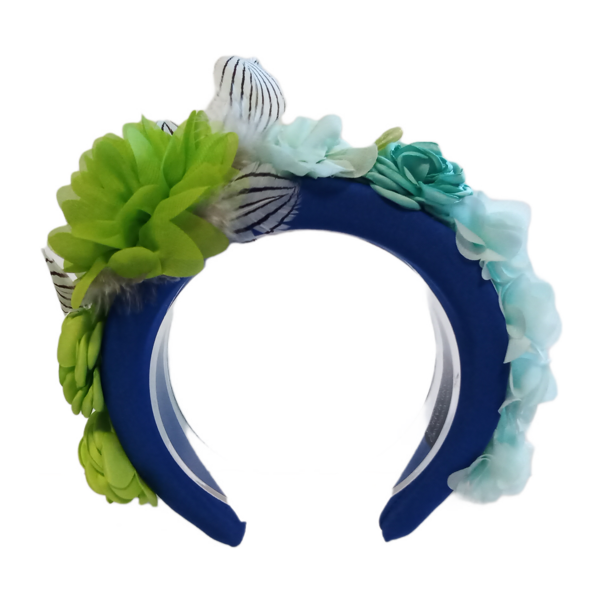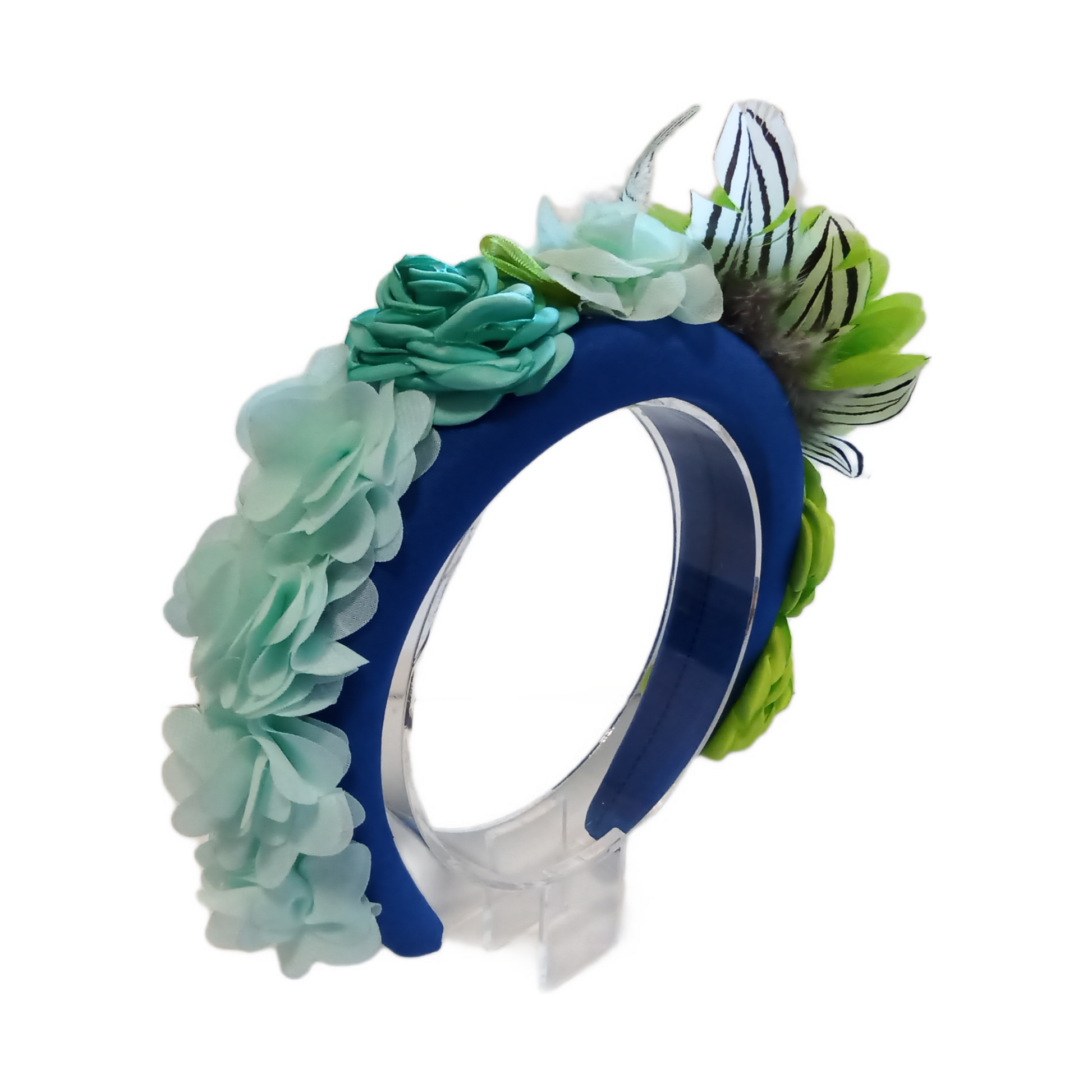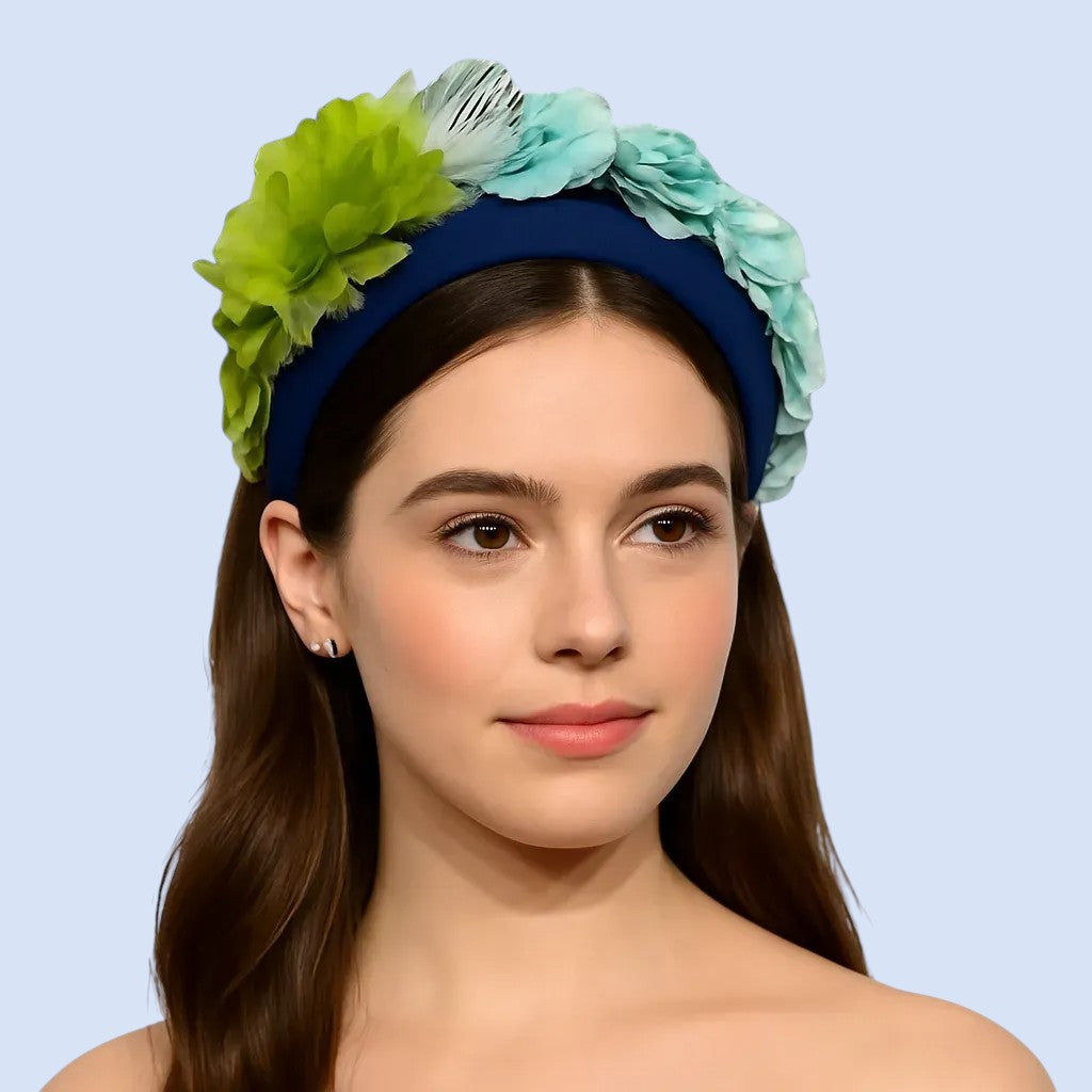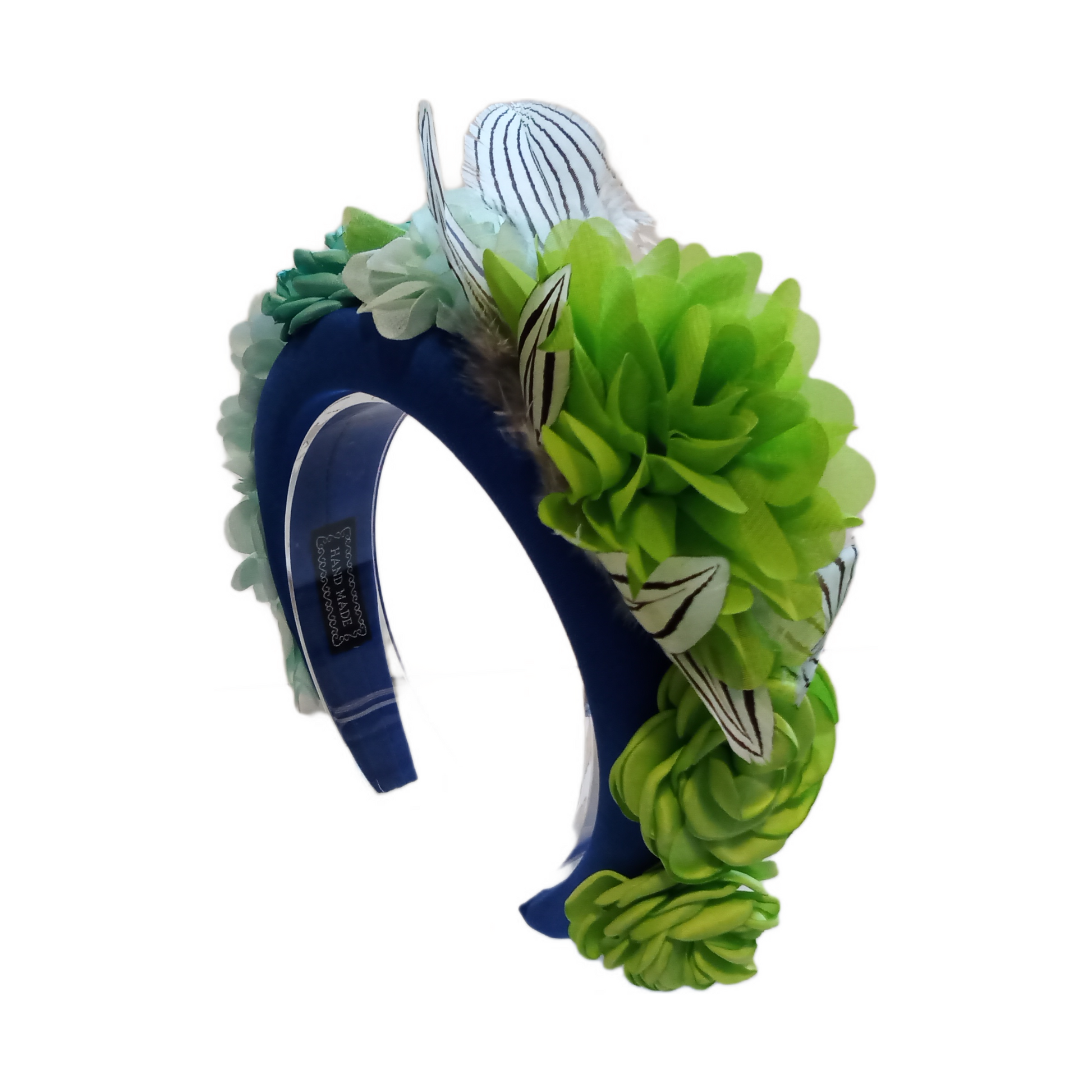 This expertly crafted handmade headband features a stunning green floral design. Perfect for special occasions, it adds a touch of elegance and sophistication to any outfit.