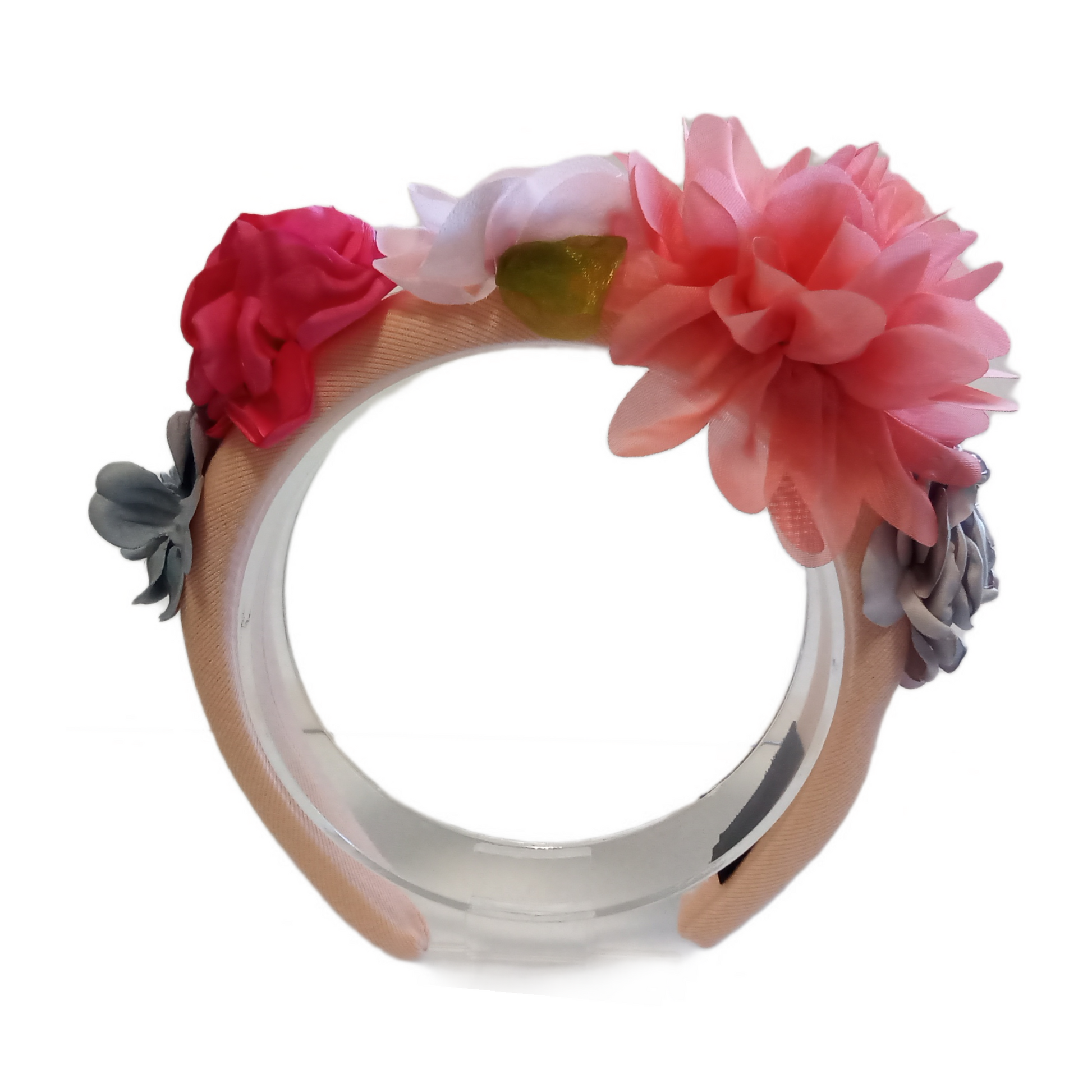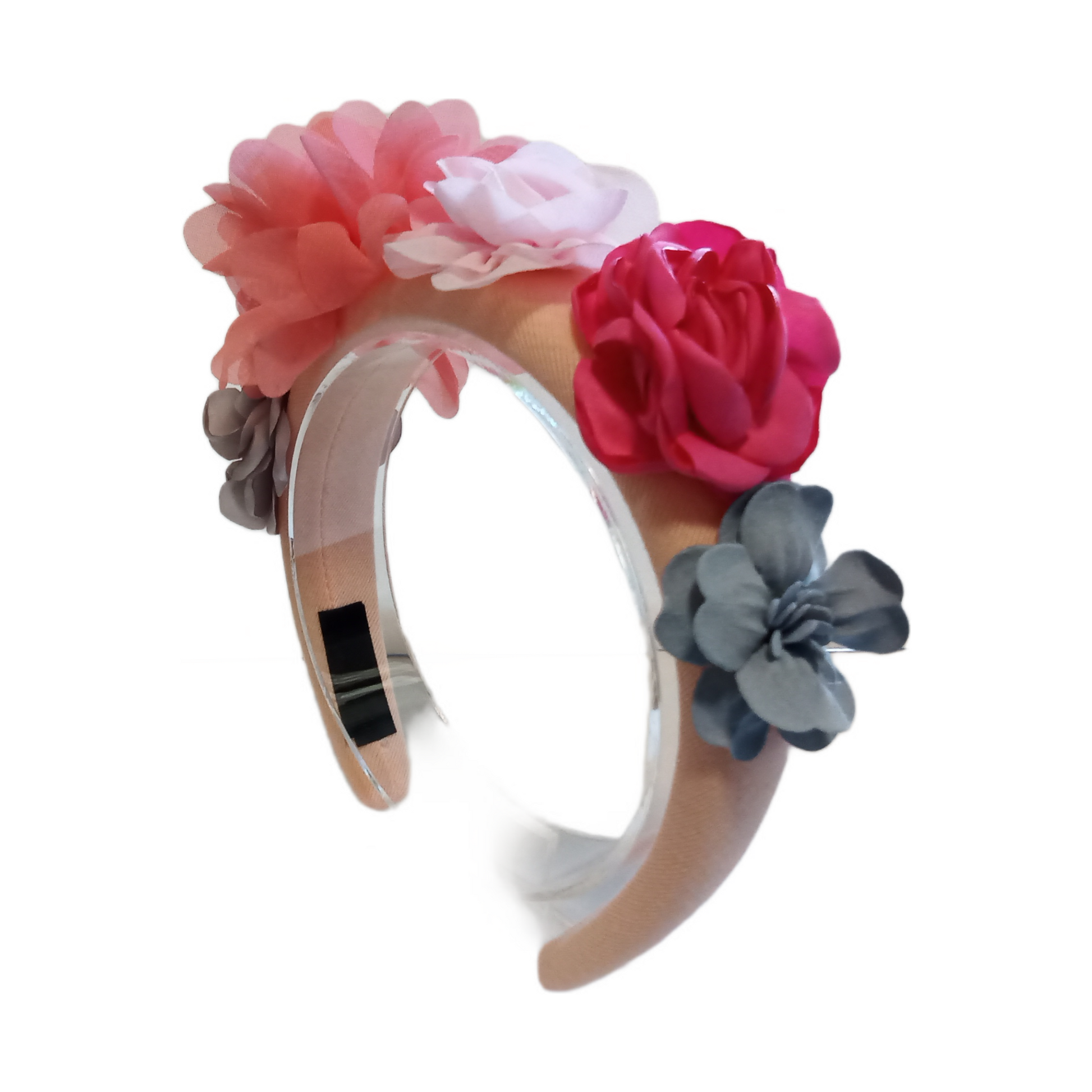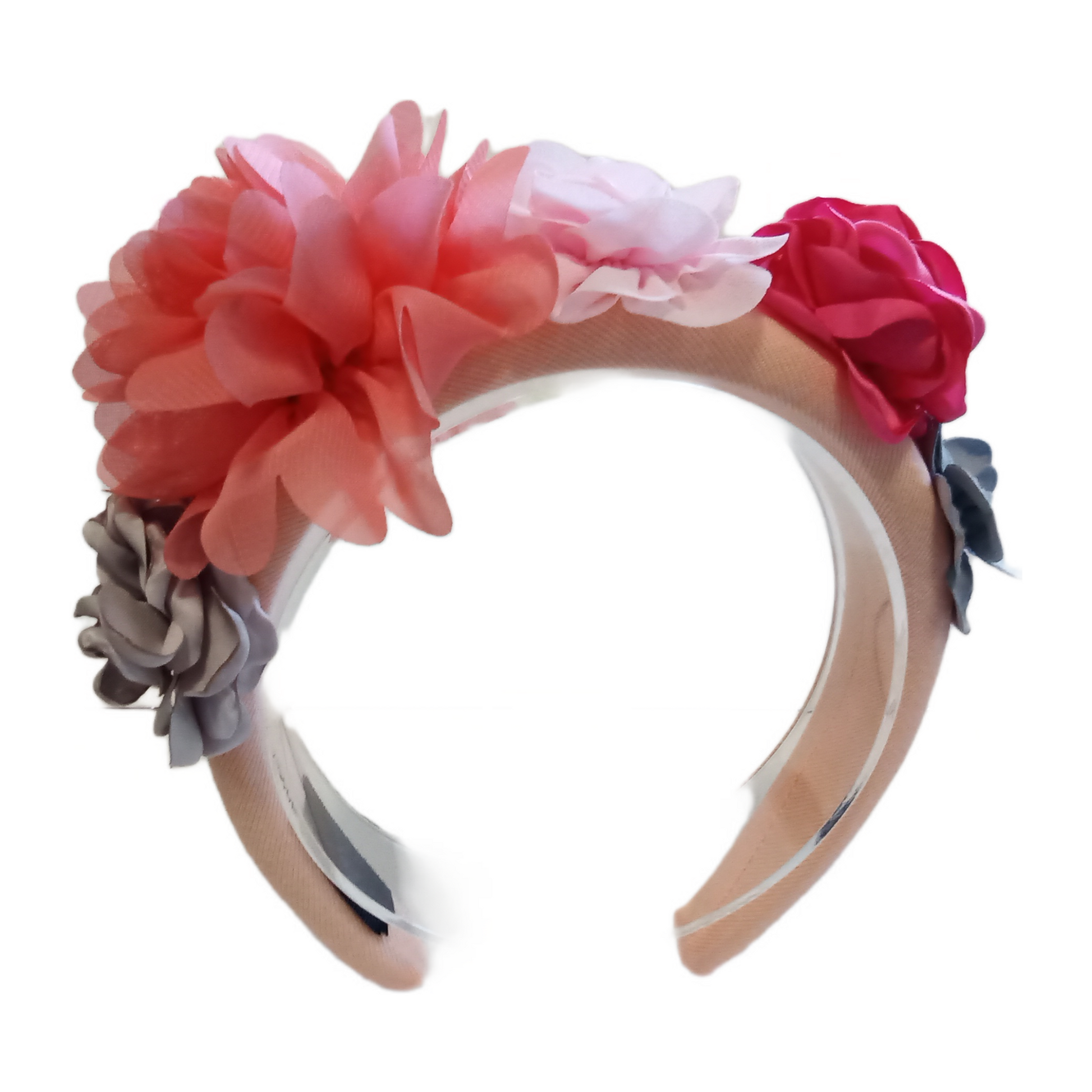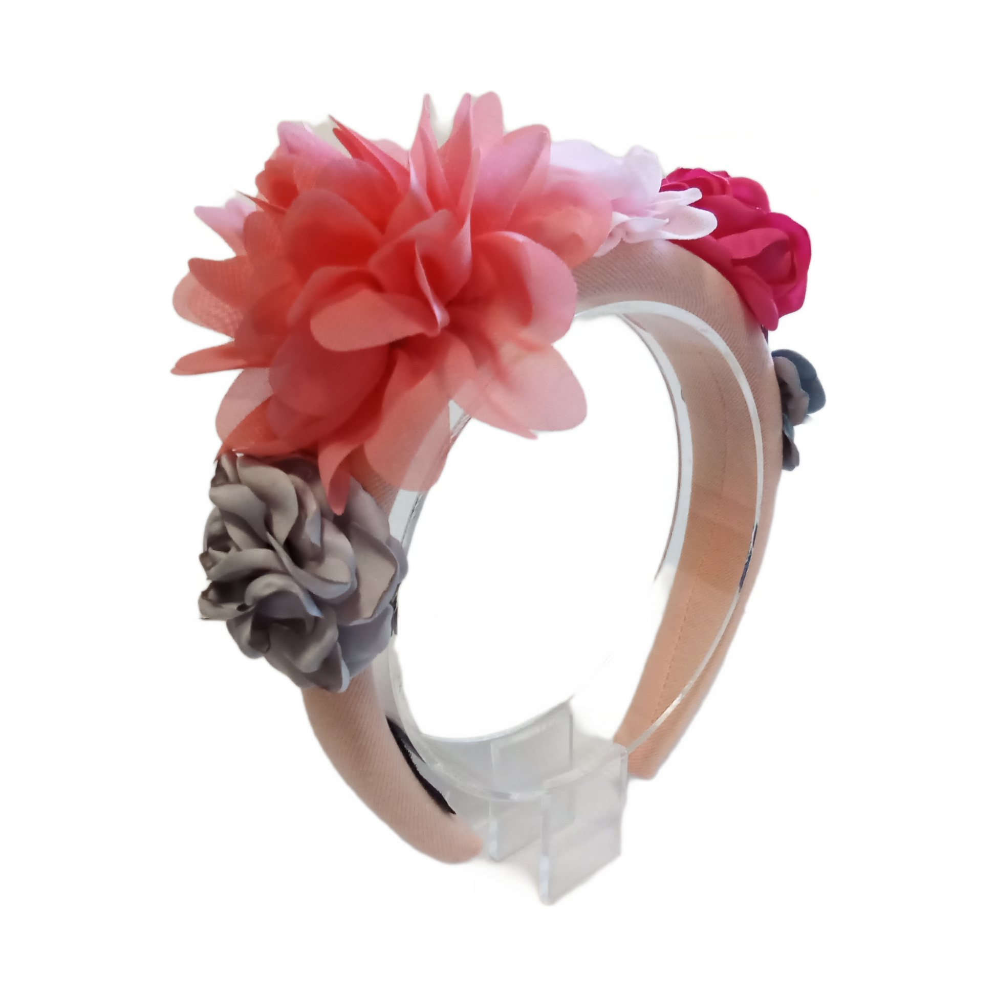 Experience a uniquely designed pink & grey floral headband. Stand out in style with its one-of-a-kind floral design that blends pink and grey hues. Elevate any outfit with this versatile and fashionable headband.