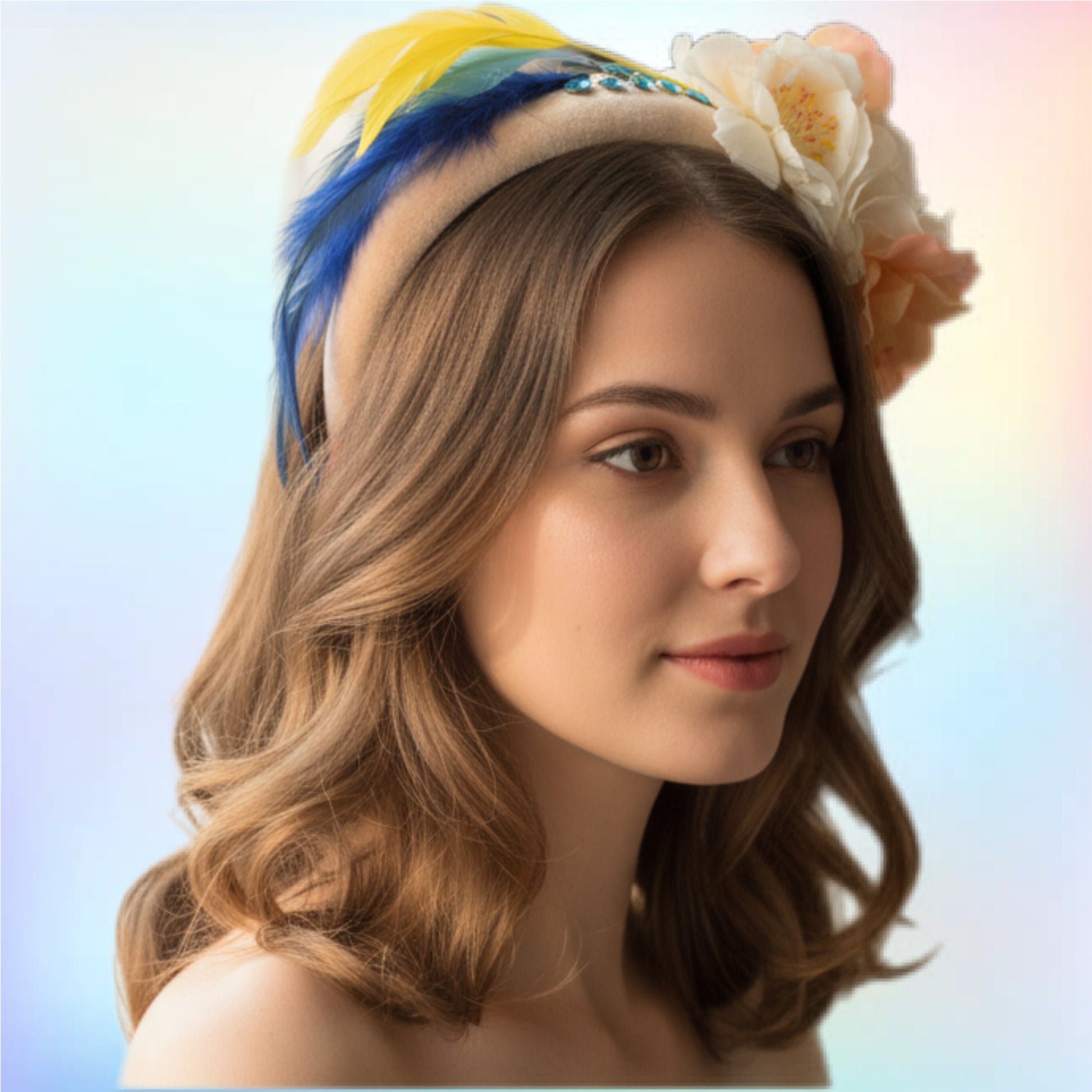 This Jasmine Floral Headband features delicate flowers, sparkling rhinestones, and elegant feathers. The perfect accessory for any special occasion, adding a touch of style and sophistication.